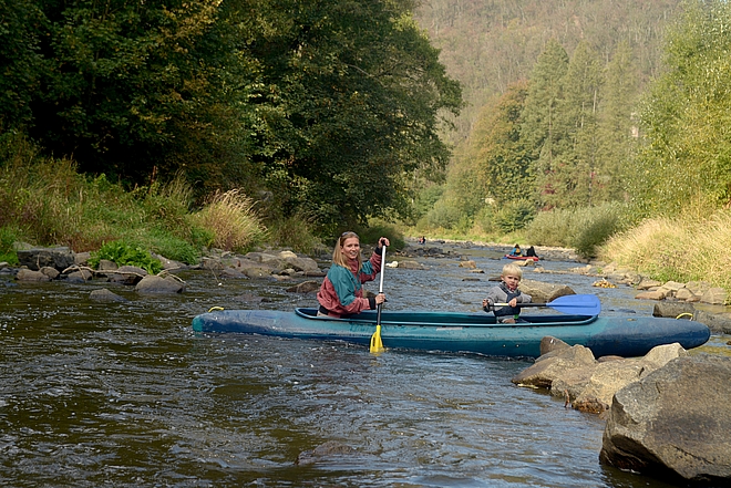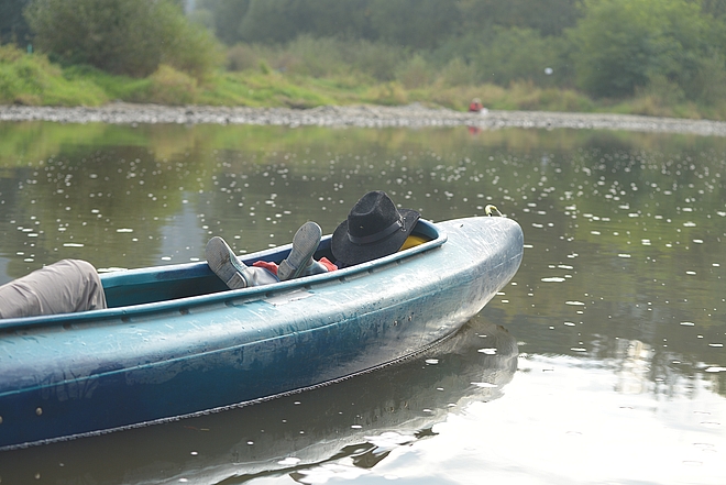 Dávno jsme si zvykli volit nejmenší zlo. Snažit se projet bez dotyku je úplně zbytečné. Kamenné prahy, kde pamětníci hovoří o peřejích, důstojně zdrncáváme. Pádlo používáme nejčastěji po způsobu bidla. Ale právě v místech ztracených peřejí loď často nabere v proudech nevídanou rychlost, aby o to rychleji naletěla na šutr. To se potom ozve tak zlověstné praskání a skřípání, až to příliš důvěrně připomíná zaniklou dobu laminátových lodí. Mimochodem, laminátovou loď bychom brzy nesli v pytli.