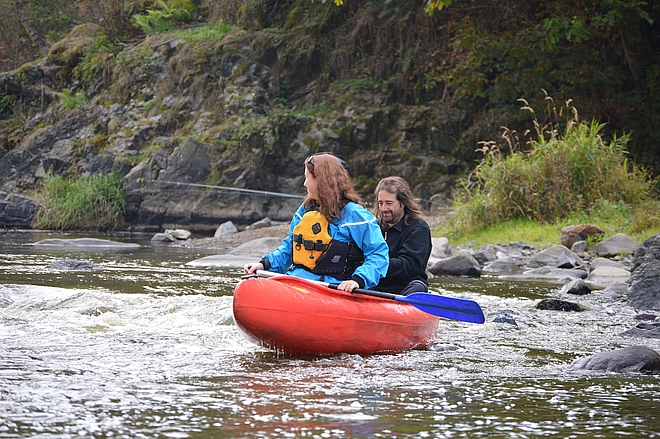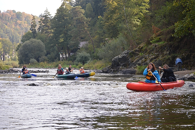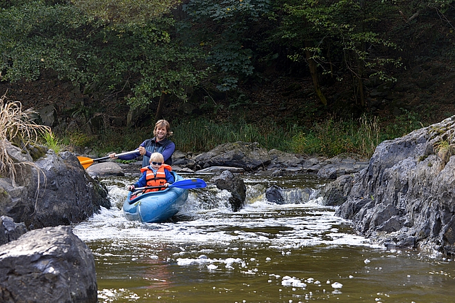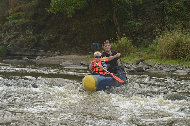 „Na pekaře!“ Když není prostor na pádlování, pomůže brzdění nohou o kameny. To umožní zastavit, zacouvat a zkusit to jinudy a lépe. Je trochu smutné, že i při tomto systému sjíždění jsou hydroboty – vysloužilé kecky Marshall od Kennu – mokré tak akorát od ranní rosy. Všechny ostatní cákance pobere postarší membrána. Skrývá se zde ale i nadějné poselství: během celého dne není ani jednou potřeba brodit a přetahovat.