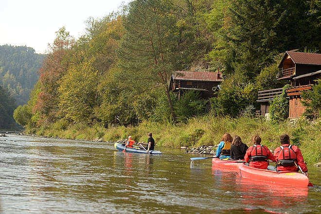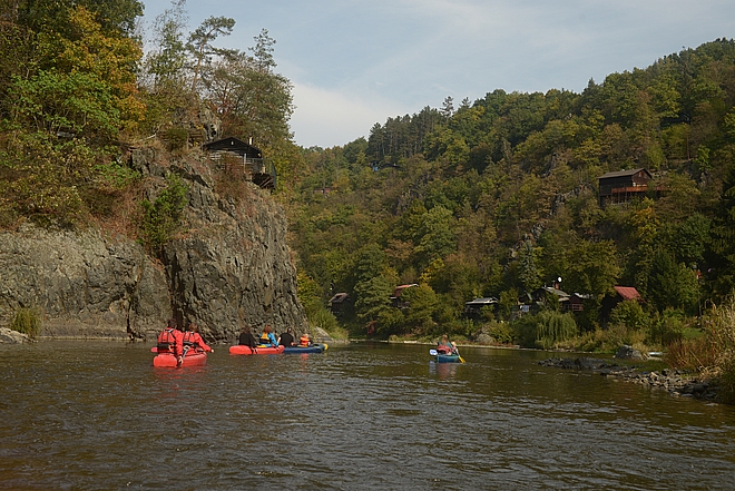 Za doprovodu písně „Pikovický blues“ seskáčeme Poslední Peřej, pak se prosmýkneme úžinou pod Pikovickou jehlou a za chvíli nás Malý Divoký Západ propouští.