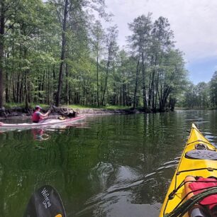 Po opuštění ostrova Szeroki Ostrów nás čekalo ještě několik dalších kanálů a jezer až do města Pisz. Trochu psycho bylo pádlování proti větru, a to hned dvakrát na jezeře Roś, které má tvar ostře zalomeného písmene S. Tento den pro nás byl rovněž ve znamení dálkové rekordu, protože jsme to natáhli až na začátek řeky Pisa. Škoda jen, že náplavka ve městě Pisz není přívětivá k vodákům a takřka nikde se nedá vystoupit. My to vyřešili výstupem z řeky pár desítek metrů od náměstí s horolezeckou vložkou a přivázanými loděmi v proudu. Odměnou za tento výkon nám byla skvělá zmrzlina v místní kavárně.