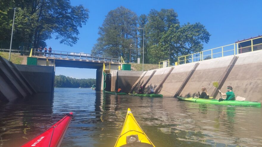 Pádlování začíná klidným a poměrně úzkým jezerem (již zmíněné Jezioro Nidzkie), kde po změně směru na sever postupně přibývají plachetnice. Ty nás ostatně provázely po celou dobu plavby až k městečku Ruciane-Nida s přístavem a cca 150 m dlouhým kanálem Kanał Nidzki. Tímto kanálem jsme se protáhli do na zdejší poměry malého jezera Guzianka Wielka a dál jsme pokračovali přes ještě menší jezero Guzianka Mala do velkého a hlavně dlouhého jezera Bełdany. Mezi jezerem Bełdany a oběma jezery Guzianka se již od roku 1879 nachází stejnojmenná plavební komora (Guzianka), která překonává rozdíl dosahující dva až tři metry mezi vodními hladinami obou jezer, a je díky tomu dodnes důležitým dopravním uzlem na cestě k Velkým Mazurským jezerům. Tuto plavební komoru pravidelně využívají velké lodě pro přepravu cestujících, turistické jachty a rovněž kajaky jako ty naše. Odhaduje se, že jí ročně propluje až 15 000 plavidel. Letos jsme platili 5,40 zlotých za loď. Během klesání si peníze odlovil do podběráku zdymadlář a neobtěžoval se s vracením drobných.