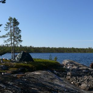 Začíná další etapa. Musíme se propracovat soustavou jezer až na Surnujärvi. Bude se jednat o krátké přejezdy menších jezer a přenášení. Nejprve vždycky vynášíme batohy, pak se vracíme pro prázdnou loď, kterou neseme nad hlavou. Člověk musí neustále dávat pozor, kam šlape. Právě ze zranění při přenosech jsem měl při přípravách největší obavu a terén mi ji potvrzuje. Na březích píská halda hladových komárů a bzikavek, k nim se přidává vedro, únava a zapařené nohy v mokrých botách a kalhotách. Naštěstí ale protahujeme loď dnešní poslední peřejí. Nasedáme, záda v jednom ohni od štípanců, ale klidná hladina a vědomí, že dnes už máme odpracováno, všechno tlumí. Vedle nás v mělké vodě zaloví ryba, a tak hned vypouštím na lov naši třpytku a během pár minut máme večeři. Příroda je tu téměř nedotčená a dva dny jsme už neslyšeli žádný zvuk civilizace. Musíme jen doufat, že to tak zůstane. Je dobře, že místní terén svou nepřístupností odrazuje davy turistů. V jednom z průvodců jsem mimochodem zaznamenal následující: „Za jezerem Inari naleznete pouze bažiny a hejna komárů.“