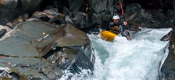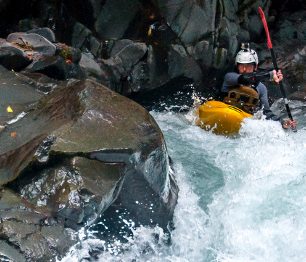 Nejlepší by ale bývalo bylo, kdyby tam žádný vodopádek nebyl a my utekli co nejdřív. Někdy v pozdním odpoledni totiž dojíždíme (došutrujeme) k sifonu tvořenému kamínkem o velikosti vesnické bytovky, který se tu skutálel do řeky, a definitivně se rozhodujeme vzít lodě na ramena a utéct. Dost dlouho se škrábeme do prudkého svahu trnitou vegetací (lodě nejde než táhnout nahoru na házečkách), a když už na to skoro nevidíme, cvakáme lodě za rododendron a štrádujem si to na cestu bez nich. Samozřejmě naprosto netušíme, jak je to daleko, ale naštěstí jsme za půlhodinku na cestě a po hodinové procházce i na vysedačce. Je skoro jedenáct hodin, naše nohy po sundání neoprenek předvádějí nechutné divadlo krutosti a taky máme slušný hlad, ale jsme všichni celí a to se počítá.