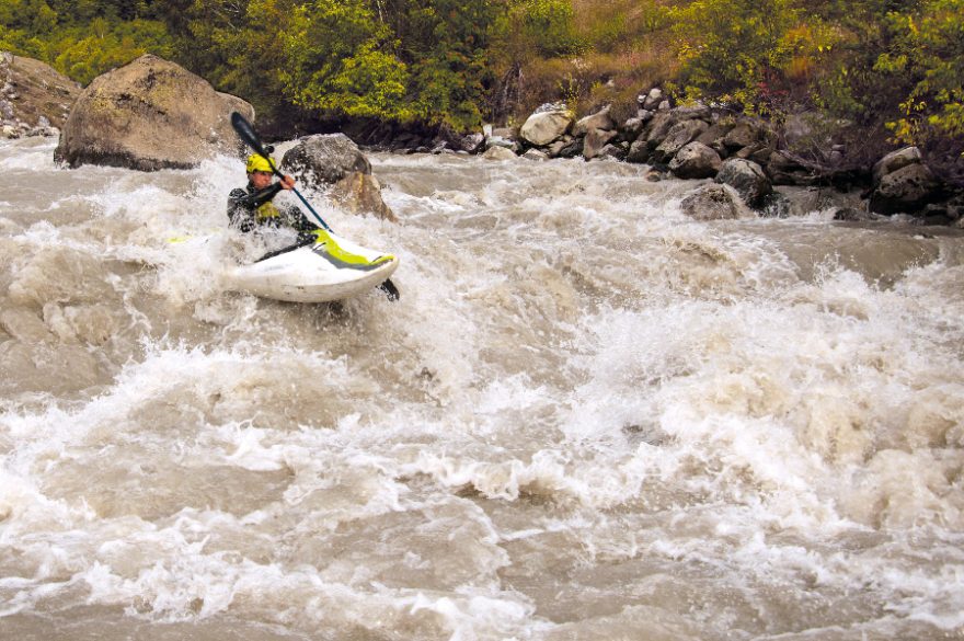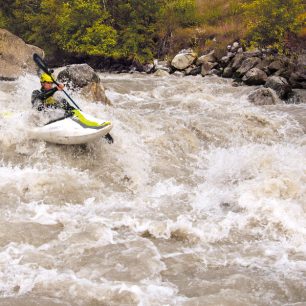 Nasedáme na dohled od ledovce a řeka nás hned po nasednutí zaskočí svou silou a rychlostí. Když se nám po kilometru konečně podaří zastavit v iluzorním vracáku, nestačíme se zase divit, jak je ve Svanetii všechno z kopce. Zastavování na místních ledovcovkách je náročné hlavně na představivost, musíte si vracák totiž nejdřív představit, a když si ho představujete dostatečně silně, tak se skutečně objeví a můžete zastavit a vydýchat se. V kombinaci se skutečně ledovou vodou by tady plavání asi bylo terminální zážitek, ale řeky pádí dolů tak rychle, že na takové myšlenky stejně nebudete mít čas.
