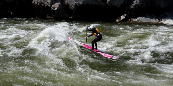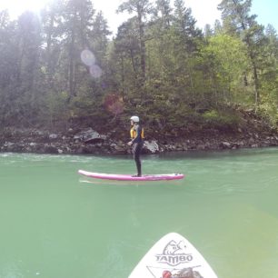Ondra se do peřejí pustil první a ustál dvě vlny jako kovaný profík, třetí ho poslala do kolen. Dál už jsem jeho výkon nemohla sledovat, protože jsem se pod náporem jedné z vln skácela do vody a začal boj. Neztratit pádlo. Dát Ondrovi vědět, že nepanikařím. Dostat se k prknu.