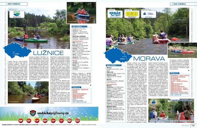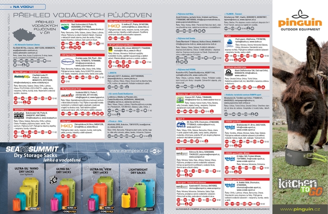 Na závěrečných stranách potom ještě přinášíme rozsáhlý přehled vodáckých půjčoven, které jsou ověřené lety zkušeností od správných vodáků. Zaručeně se v nich budete cítit dobře a budete s jejich službami spokojeni. U každé z půjčoven naleznete základy jako kontaktní informace, ale třeba i počty lodí, které nabízejí, za kolik vám lodě dovezou a další detaily. Doufáme, že i tyto informace pro vás budou poučné. Pokud by vám to bylo málo, nezbývá nám, než vás odkázat na server www.vodackepujcovny.cz.