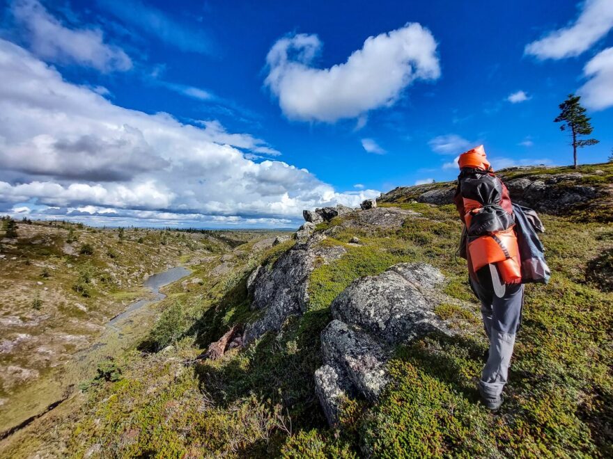 To vše bylo možné jen proto, že jsem měl v báglu loď. Tedy nenesl jsem, jak bývá zvykem, jen obrovský pytel s pětadvacetikilovou nafukovací lodí. Na zádech jsem měl obyčejný loďák od Hika, ve kterém byla kromě stanu, karimatky, spacáku, nádobí, jídla, oblečení a vůbec všeho, co se může hodit, také loď pro tři. Packraft. To vše dohromady se v pohodě vešlo do nějakých patnácti kilo váhy.