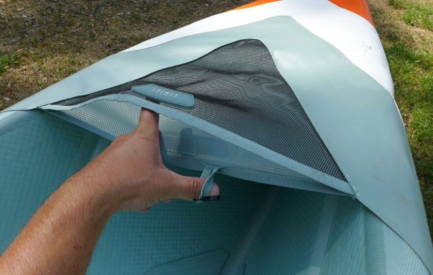 „Břicho“ kánoe je hodně široké a obsahuje napevno připevněný drop-stitch kvádr, který slouží jako sedátko pro děti. Střed lodi je velmi prostorný a my jsme jej v průběhu používání překřtili na dětské hřiště, protože i dvě děti (maximální kapacita lodi je 2 dospělí a 2 děti) se sem v pohodě vejdou, a ještě zbývá místo na hračky a lumpárny. Zároveň lze ale prostor využít k naložení značného množství bagáže, pro kterou jsou navíc na dně umístěná nejrůznější oka z plochých popruhů určená pro její uchycení. Další bagáž by bylo možné naložit do přední a zadní špice, kde je také docela slušný prostor.