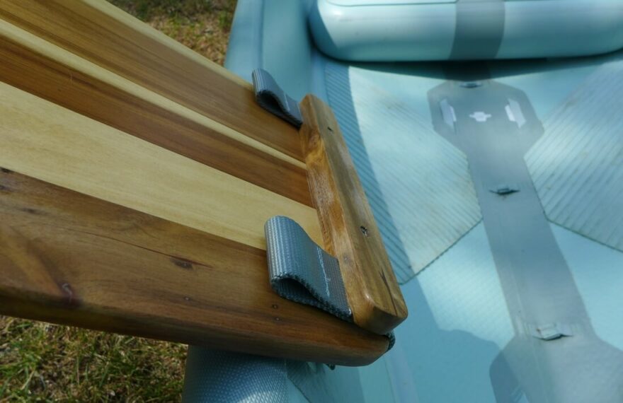 Po nafouknutí už stačí jen upevnit sedačky, které jsou vyrobeny ze lakovaného dřeva, které je kvůli pohodlí a tření na příslušných místech doplněno u tenkou vrstvu minicellové pěny. Upevnění sedačky je řešeno způsobem, nad kterým jsem se zpočátku podivoval. Na spodní straně každé sedačky je souběžně s borty umístěná dřevěná lišta, která má vždy vpředu a vzadu probrání. Do tohoto probrání se zasunou ploché popruhy upevněné na bortech, takže sedačka na těchto popruzích visí. Kdo neporozuměl, ten ať se podívá na fotografii.