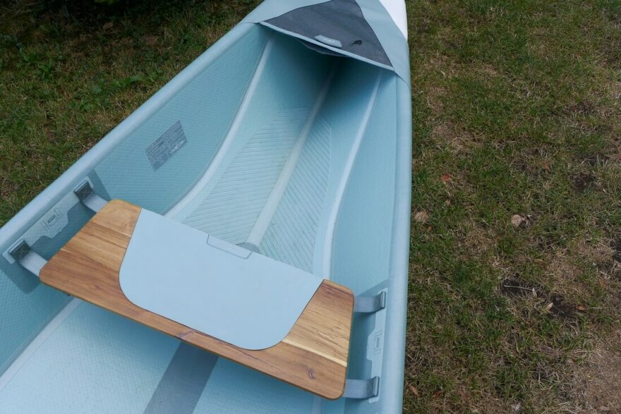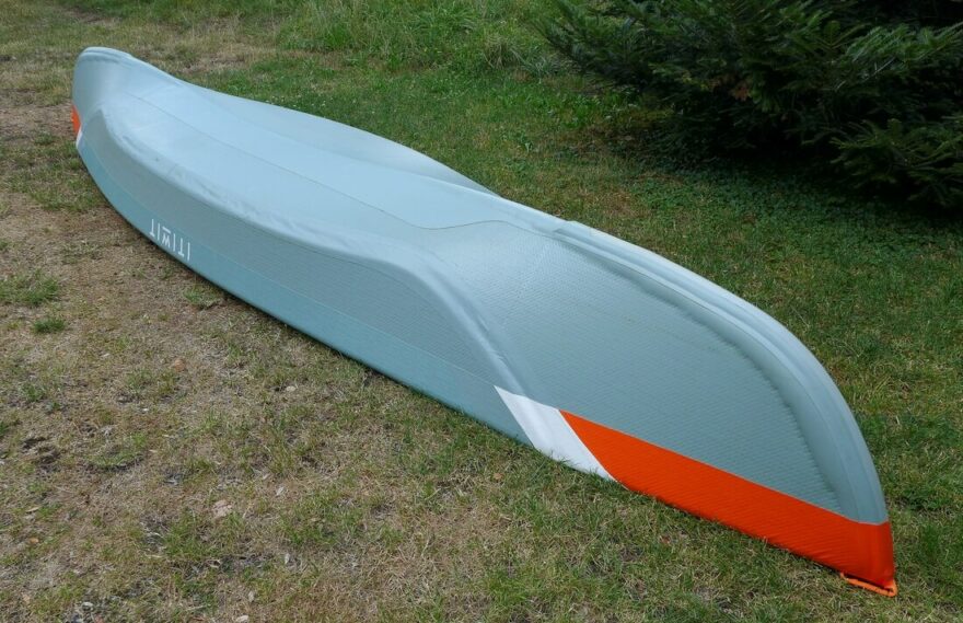Konstrukce kánoe je na standardy drop-stitch nafukovaček dost neobvyklá. Nejedná se totiž o tvar „maňásek“, který využívá drtivá většina jiných výrobců, ale spíše o tvar „kánoe indiánky“. Dno je uprostřed lodě téměř ploché, ale směrem ke špicím se postupně zavírá do tvaru ostrého V. To má za důsledek vytvoření dvou „kýlů“ pod přední a zadní špicí. Ty v součtu tvoří skoro dvě třetiny délky lodě. Oba tyto kýly jsou kryté litou gumou, aby se zde materiál neprodřel. Přímo ve špicích je pak drop-stitch komora tvořící dno ohnutá takovým způsobem, že sahá až k přední, respektive zadní palubě. Přišlo mi až neuvěřitelné, jakým způsobem dokázal výrobce drop-stitch materiál natvarovat. Za mě opravdu klobouk dolů, tudy nepochybně vede další cesta kupředu. Komory tvořící borty jsou tvarované výrazně méně a vlastně jen uzavírají kánoi od jedné paluby k druhé, plus drží sedačky.
