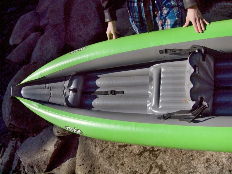 Současný Twist je něco jako starý přítel v novém kabátě. Stejný model, který jsem shodou okolností testoval před několika lety, se nyní vyrábí z nového materiálu, tzv. Light Nitrilonu. Výměnou smáčivého textilu s gumovou vnitřní vrstvou za plnohodnotný nitrilon ovšem působí Twist mnohem méně jako matračka a víc jako seriózní loď. Ale abychom srovnávali srovnatelné: při použití běžného, standardního nitrilonu by byl Twist v tomto provedení podstatně těžší. Light Nitrilon ale poskytuje dostatečnou kvalitu, protože narozdíl od modelů na divokou vodu Twist nepotřebuje tak vysokou odolnost proti oděru.