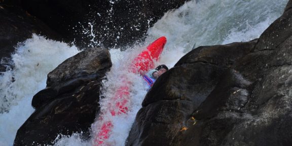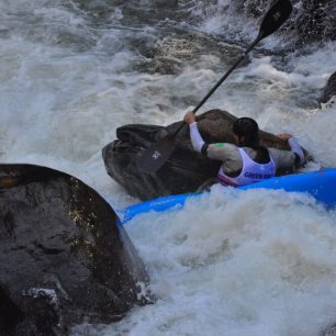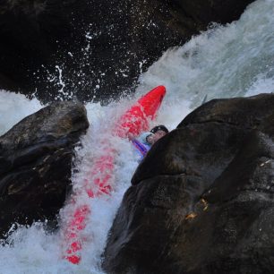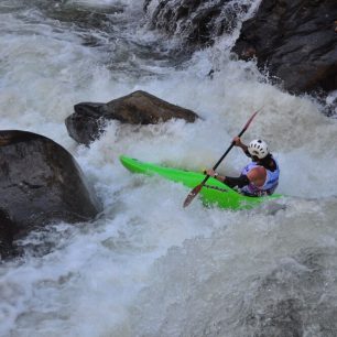 Přejít do galerieNa videu to sice vypadá, že musíš projet sifonem, v reálu mě tahle peřej ale opravdu vyděsila. Za mě to bylo jasné. Ještě že tu je dámská cesta, kterou se dá peřej úplně objet po slajdu. Nájezd do ní ovšem taky není vůbec zadarmo. Najíždí se proudem vpravo, chce to ale co nejméně rychlosti, aby člověk zbrzdil bokem o kámen a zahnul tak ostře doprava. Andrew najel první a já následovala. Sice jsem se snažila jet pomalu, ale přesto to bylo moc rychle. Najela jsem na rozdělovací kámen, ale místo toho, abych špici stočila doprava, byla jsem napláclá bokem a mířila doleva. Vyděšeně jsem se snažila pádlovat zpět, ale moc to nezabíralo. Už jsem se pomalu začala smiřovat s tím, že bez rychlosti vjedu do levé lajny, ale pak jsem odhodila špici proti proudu, vypádlovala vší silou a přesunula se do bezpečné pravé strany. Uf, to bylo o fous.