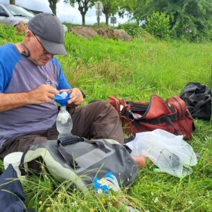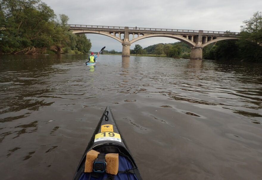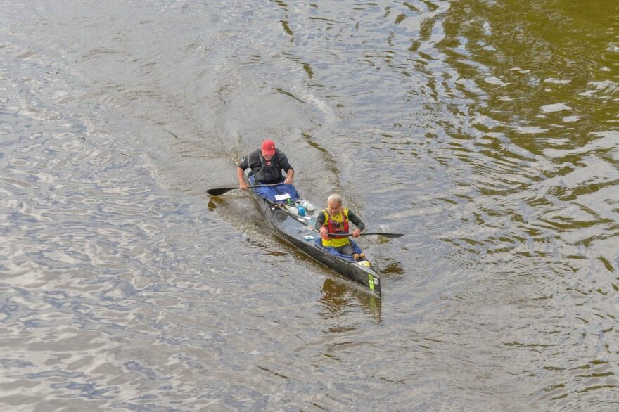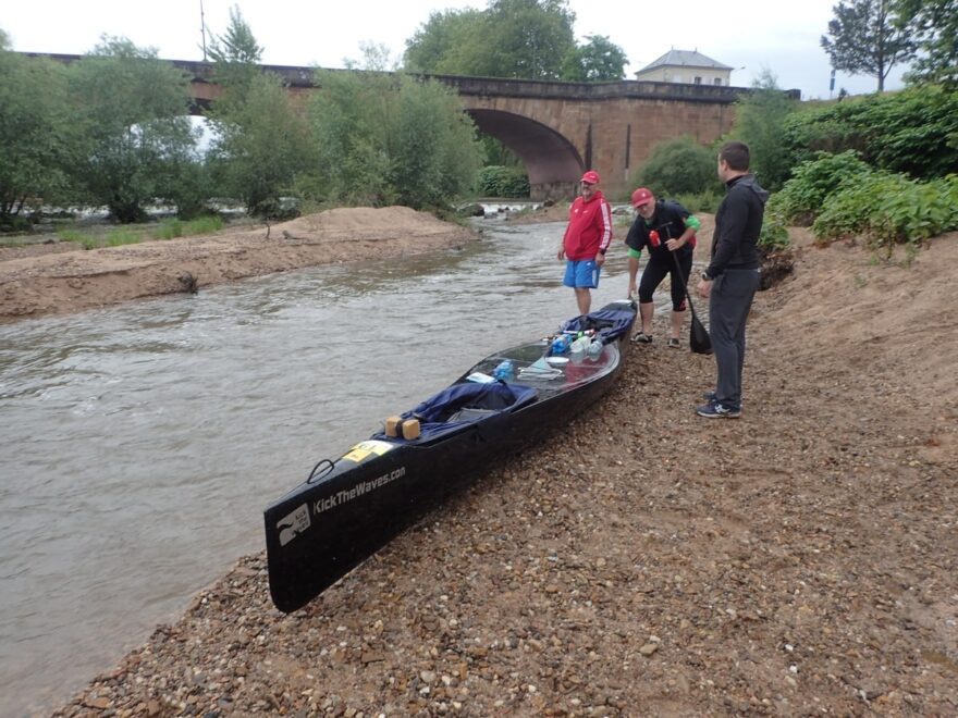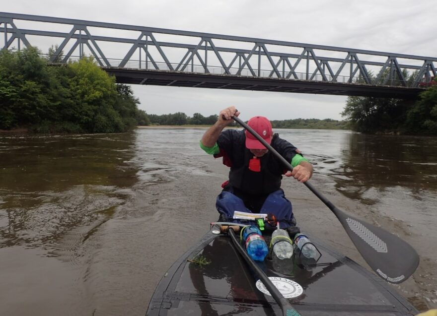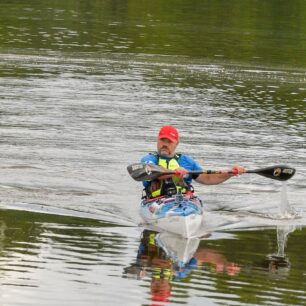 Dnes kupodivu Pašík prosí o zastávky, aby se mohl protáhnout. Bolí ho sedací část. Já mám radost, že jsem v pohodě a tělo si na zátěž pěkně zvyklo. Kluci nám dokonce připravili jídlo na rychlé občerstvení během dne. Hodíme do sebe několik lžic a pokračujeme dál. Co se jídla a pití týče, Pašík má na každou etapu několik litrů pití a jede na energetické gely. Mně stačí 1,5 litru pití a sním nějakou tyčku nebo sušenku. Dokonce jsem viděl jak kajakář, kterého jsme předjížděli, ukusuje bagetu, a tak jsem to také zkoušel.
