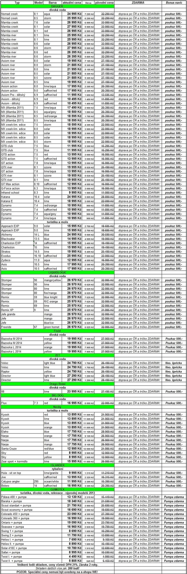 Vodácká prodejna Water Element pro Vás připravila speciální nabídku na vybrané skladové lodě a velké množství vodáckého vybavení. Všechny kajaky nyní zasíláme po ČR zdarma, každý zákazník bude navíc zařazen [url=http://www.vodacke-centrum.cz/velka-vodacka-soutez-2014/t12 newwindow]do soutěže[/url] o lodě a vodácké vybavení!