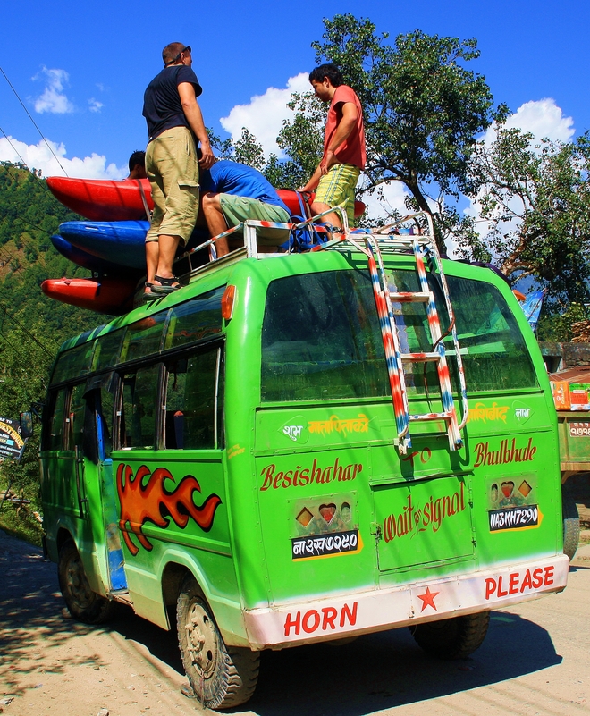 Další z pro Nepál typických věcí je snadné cestování s lodí. Poprvé jsem byl v destinaci, kde skvěle vystačíte s veřejnou dopravou a vymýšlet cokoliv jiného by byla prostě hloupost. Z hotelu se jednoduše necháte taxíkem či rikšou za pár rupek odvézt na nejbližší autobusové nádraží. Najdete si autobus, lodě naložíte na střechu – spolucestující vám s tím ochotně pomůžou – a sednete si dovnitř, pokud je tam místo. Když už tam místo není, naskočíte na střechu a svezete se pěkně na průvanu spolu s nákladem čehokoliv, co se dá na střechu dostat. Během jízdy se na střechu vyhoupne i asistent pana autobusáka a pro změnu si zasmlouváte o ceně jízdného. Vůbec nevadí, že to trvá třeba dvě hodiny, alespoň vám cesta pěkně utíká a vy máte nového kamaráda.