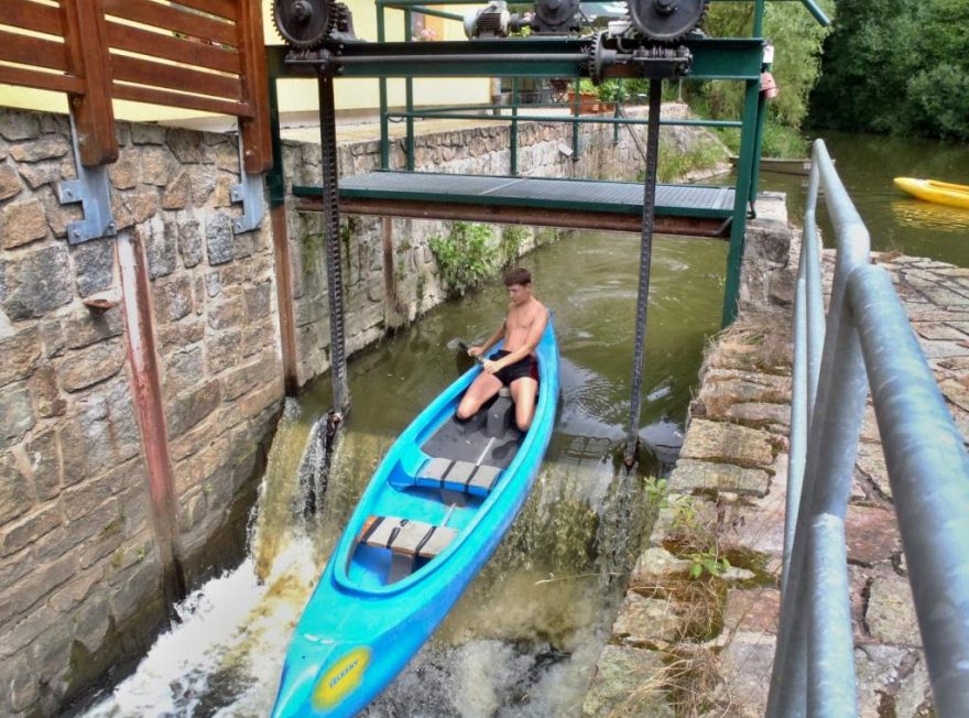 Nakonec jsem vzal celou rodinu a zbaběle to ještě pokrátil jen na hodinový průjezd historickým centrem s přenášením pouhých dvou jezů. Začínali jsme pod jezem Lada, kde je pěkné parkoviště a končili u Penzionu Dobré časy, kde se dá také zanechat druhé auto. Je to opravdu kousek, a tak se nabízí i možnost jít zpátky pěšky nebo si tam nechat kolo.