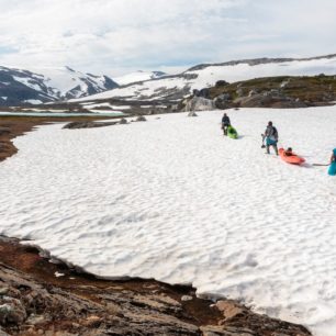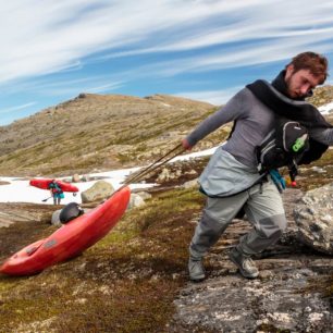Vstáváme se sluncem velice vysoko a vyrážíme na další část pochodu. Je sice polovina srpna, ale letošní zima nadělila extrémní množství sněhu, takže je ho zde stále opravdu hodně. To je paradoxně pro chůzi s kajakem značná výhoda – jednoduše ho táhnete za sebou jako sáňky. Po hodině a půl máme v cestě první jezero, posléze následuje druhé, a když konečně vyšlápneme na obzor, je vidět dlouhé údolí, kde začíná samotná Glomåga. To už si to šineme z kopce a konečně přichází první záběry pádlem na řece, za kterou jsme se vydali. Ač je kolem hodně sněhu, vody je spíše málo. Teploty v noci nejsou příliš příznivé k tání a i přes pěkné počasí se už každým malinkým přítokem nesbírají velké kubíky. Za nižší vodu jsem nakonec rád. Glomågu jsem jel prvně dva roky nazpět, bylo hodně vody, horní pasáž byla velice výživná a spodní kaňon byl spíše děsivý.