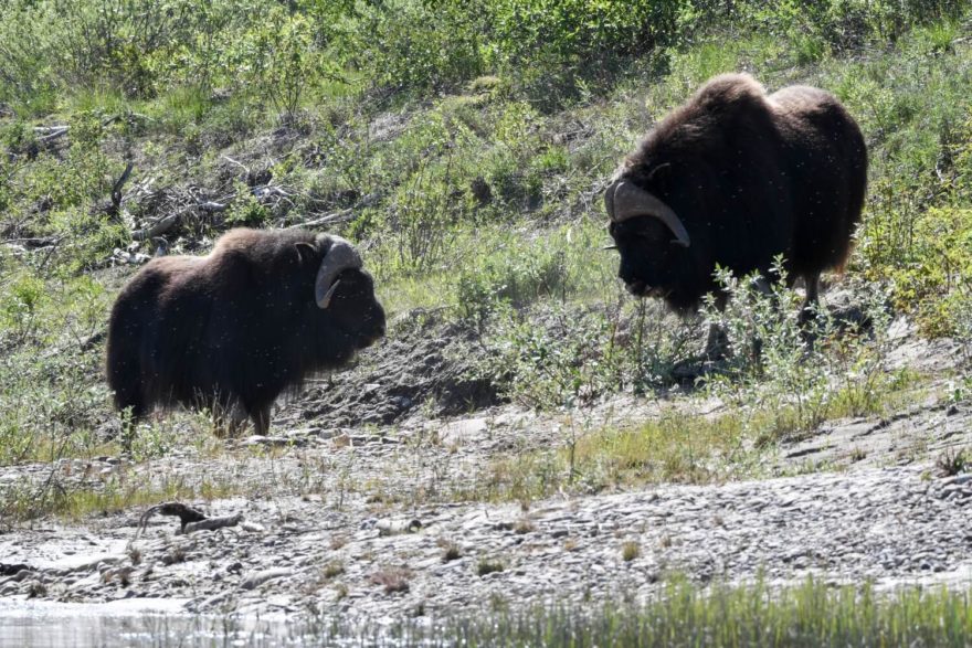 Za chvíli nám na břehu pózují vlci. Pižmoně jsme přestali počítat už dávno. Každých několik minut vidíme nějaké velké zvíře nebo skupinu. Rádi se drží u vody. Losice jsou zde velmi zvědavé a okukují nás z vody i zpoza stromů. Další medvěd nám přijde do tábora rovnou ke snídani a opět ho musíme zahnat petardou. Zvířata se nás vůbec nebojí, což je u medvědů grizzly dost nepříjemné. Vlci se vyloženě chodí každý večer dívat, co vaříme k jídlu.