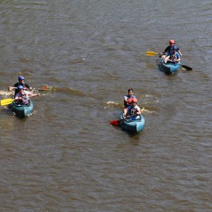 Odpoledne se také vydaly po úkolech starší děti od 12 do 15 let na kánoích a plnily podobné úkoly jako mladší kamarádi. I zde rozhodl o startovním pořadí počet bodů. Závod ve sjezdu byl naplánován na nedělní dopoledne. Sobotní večer byl kromě doprovodného programu v kempu a společných radovánek účastníků také věnován závodu ve sjezdu v kategorii vedoucích. Mezi dvacítkou lodí si s hromadným startem, samotným sjezdem i brankovištěm poradili nejlépe vedoucí z Libeňské Loděnice Vltava. Večer si každý užil po svém. Zpěv a kytary zněly dlouho do hluboké noci.