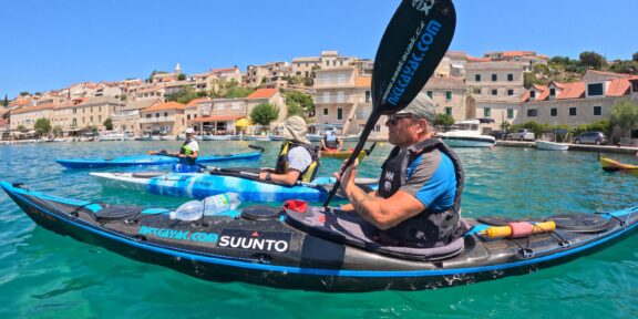 Nejčastěji to probíhá tak, že ráno vypluješ z přístavu, dojedeš na první místo, tam se vyloží kajaky a začne praktické cvičení ovládání kajaku, lidi absolvují nácviky záchrany a další nezbytnosti. Loď pak třeba někam popojede a my k ní dopádlujeme. Na kotvišti si ještě ostatní lidi můžou dát na vodu paddleboardy a projet se nebo šnorchlují, opalují se. Pak se všechno naloží a jede se na jiné místo. Během cesty je oběd. O tom ti taky musím povědět, protože bych nikdy nevěřil, že se dá na lodi uvařit něco tak fantastického. Kuchařka Anita nám připravuje klasickou dalmatskou kuchyni a je to úplné gastroporno. Po obědě se dostaneme na místo odpoledního programu, kde jde na vodu druhá skupina, večer se po večeři zakotví v nádherném ostrovním přístavu, přespíš v kajutě a ráno vyplouváš dál.