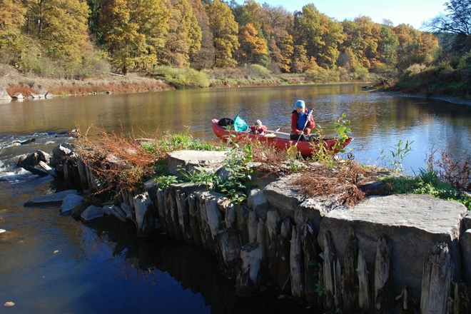 Hned pod nástupem je jez U Sulanů, který bývá za nejvyšších vodních stavů Orlíku také pod vodou a dál je obyčejně již jen jezero. Jez je hodně rozbořený, sešoupli jsme ho při levé půlce. Dál řeka vypadala úplně normálně, břehy zarostlé a ani nebylo poznat, že by to tu někdy bylo zatopené.