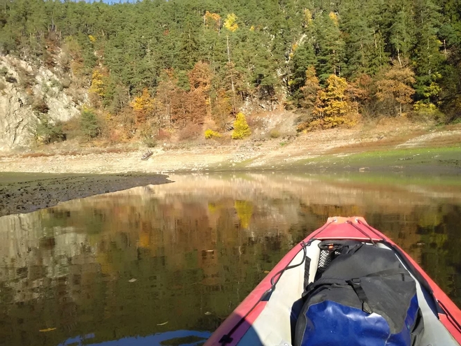 Po chvíli se mezi nánosy ukáže očištěný kus regulační navigace pro vory, pak se po stranách objevují skály. Tady už jsme pluli opravdu hluboko pod běžnou hladinou přehrady. Dokazovaly to nejen pramice přivázané ke stromům vysoko v lese, ale i hausboaty a další větší lodě na suchu. Kolem řeky jsme viděli „zkamenělé“ pařezy zatopených stromů, dávnou zapomenuté zatopené rozpadlé rybářské lodice, ale občas i nějaký ten buben z pračky. Očima vyhledáváme různé bizardnosti – rybářské přístřešky, upravené cestičky a plovací mola u chat, které jsou teď vysoko nad hladinou řeky.