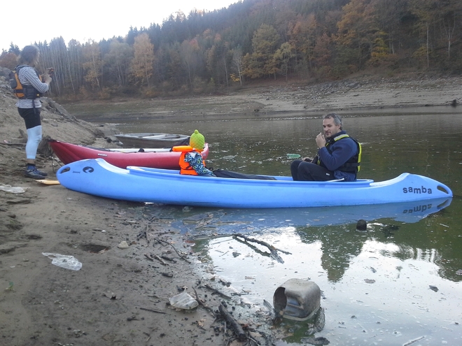 Ca 1,5 km před soutokem s Lomnicí se řeka zastavila, dopluli jsme na vzdutí přehrady. Pádlovali jsme po divně zelené hladině a mezi PETlahvemi až k ústí Lomnice na ř.km 7,2, kde je na pravém břehu pevný a nepříliš prudký břeh vhodný k výstupu, problém je pouze s příjezdem auta od vesnice Oslov, který je ozdobený několika zákazy vjezdu.