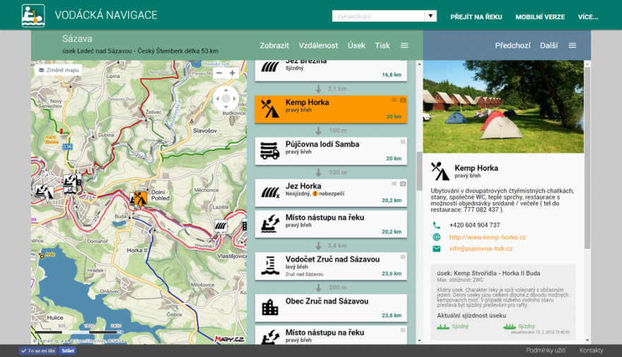 Základní informace jsou na Vodácké navigaci k nalezení snadno a rychle. Webová aplikace umožní jednoduše naplánovat „vodu“, tedy vybrat zajímavý a aktuálně sjízdný úsek řeky, zjistit vše o obtížnosti, jezech a nebezpečných místech, najít vhodné kempy, parkování a výdejní i sběrná místa půjčoven. U popisu sjíždění/přenášení jezů je většinou k dispozici i názorné a přehledné schéma. Vše je možné vytisknout a vzít s sebou na vodu nebo poslat kamarádům do emailu.