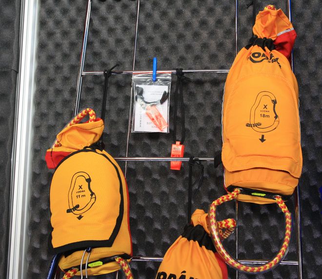 Z dalšího sortimentu byly zajímavostí na stánku házečky s označením X-VODÁK, které mají integrovanou kapsičku na karabinu. Náhradní karabina je umístěna na boku házečky v polstrované kapse. Pokud vás tedy házející pytlíkem s karabinou zasáhne, nebude to nijak bolestivé. Díky druhé karabině je pytlík těžší a tedy se lépe hází (a na větší vzdálenost), ale karabina nemá vliv na horší vlastnosti při plavání pytlíku, protože polstrování je z plovoucího materiálu, který vyrovná hmotnost karabiny. Karabina v kapsičce navíc není na volno, ale je připevněna k vnitřnímu lanu, které je uvnitř opatřeno speciálním systémem uzlů, aby nebylo potřeba používat druhé lano či napojení.