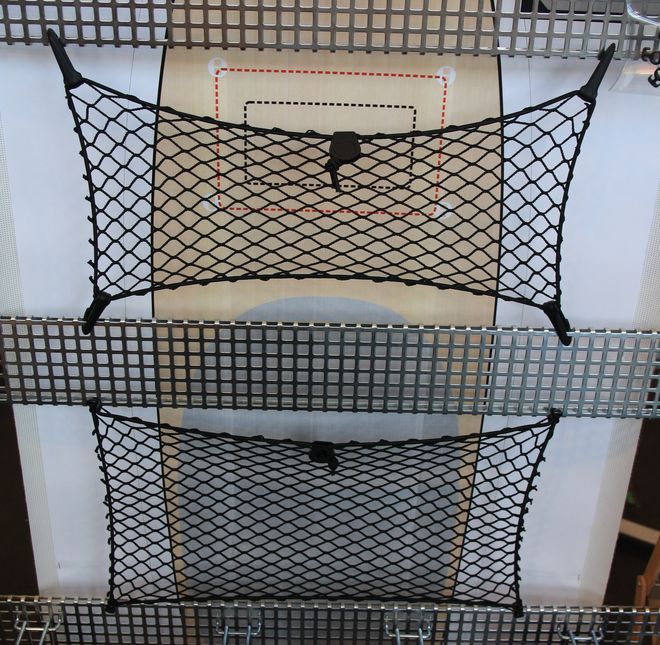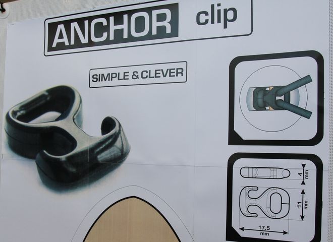 Petr Kolomý letos opět nepřivezl nic velkého, nicméně si opět celý rok lámal hlavu a vymyslel drobnou vychytávku, kterou prezentoval jako hlavní novinku ze své dílny. Jedná se o malý „háček“ Anchor clip sloužící k uchycení čehokoliv skrz gumičky na paluby surfů, paddleboardů a dalších podobných plavidel. Gumička se jednoduše provlékne skrz leash plug, lterý se standardně montuje do palub, zafixujese háčkem a je hotovo. Základními výhodami oproti klasicky používaným plastovým karabinkám je lepší splynutí s palubou, tedy, že úchyt tolik nevyčnívá z leash plugu a potom větší využití vytyčeného prostoru. Díky velikosti clipu se totiž dá do stejného prostoru uchytit výrazně větší síťka na uchycení vybavení (viz. foto).