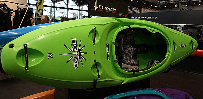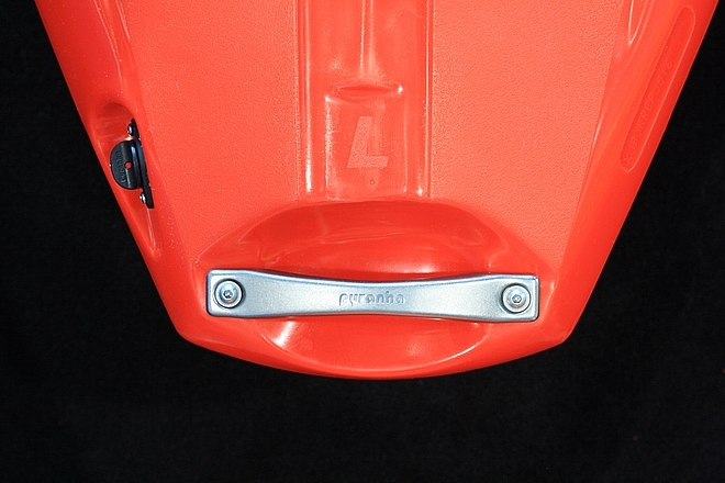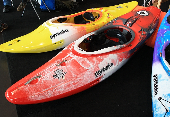 U Pyranhy letos nejvíce zaujala nová loď 9R ve velikosti L, tedy pro pořádné chlapy (její recenzi najdete v HYDRU 4/15). Klasická menší 9R byla představena už dříve, ale protože se těšila velmi pozitivním ohlasům, přistoupili v „pyraně“ i k tvorbě větší velikosti. U lodi na první pohled vidíme, že je úzká, má velmi ostré hrany, ploché dno a objemu je zde na rozdávání. Výrazný rocker úzké špice dává tušit, že se loď bude skvěle vynořovat a válce jezdit vrchem, pokud jí to jen trochu dovolíte. Protažená záď byla ke konci oproti předchozí menší verzi více zkosena, aby se při boofování nezakopávalo o hranu překážek, což určitě jízdním vlastnostem prospěje. Zajímavým prvkem je madlo na zádi lodi, které je uzpůsobeno pro snadné chytán plavajících. Vyslovili jsme obavy, že se toto madlo bude dosti trpět při nárazech o kameny při běžné jízdě, ale vše ukáže až praxe. 9R se bude dodávat ve třech stupních výbavy – expediční s odolným (ale méně stavitelným) sezením, s klasickým sezením a závodní s odlehčeným sezením a dokonce tenčí skořepinou. Vybere si tedy každý.