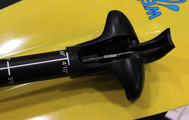 Druhou velkou novinkou, že které jsme si doslova sedli na zadek byla prodlužovací žerď na super lehkém pádle na SUP (bude se používat na všechna SUP pádla). Ovládání je ukryto v hlavičce pádla, kde při držení nijak nevadí a poloha výsuvné části žerdi je fixována jednoduchým gumovým prstencem na konci, vše tedy drží na tření. Jednoduché na ovládání, jednoduché na servis, skvěle fungující, prostě vynikající. Ale na to jsme u této značky už zvyklí.