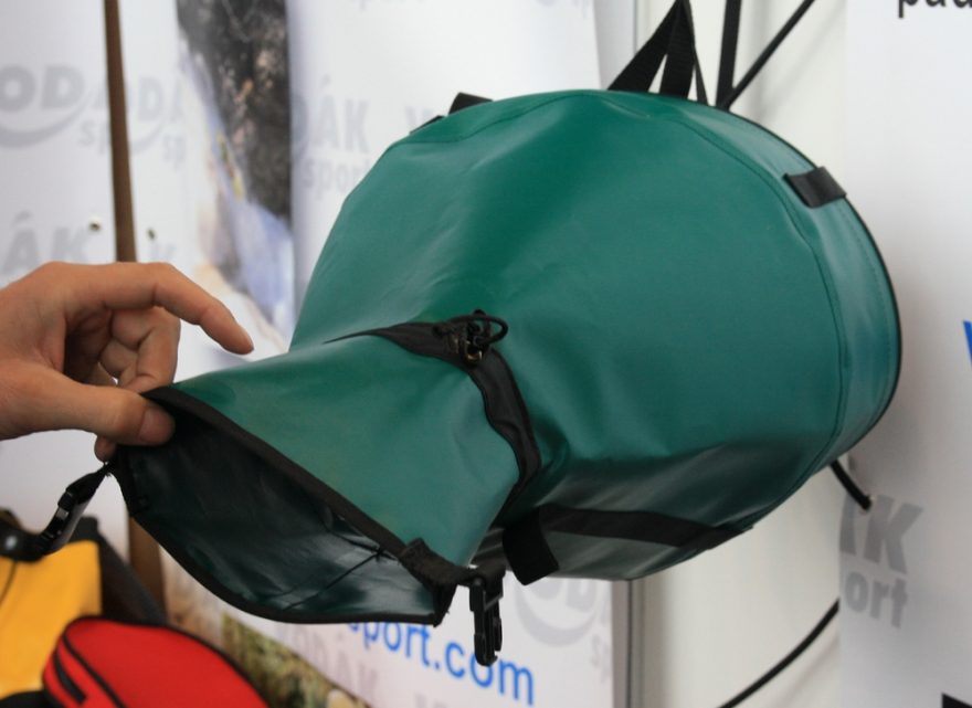 Stánek VODÁK sportu nás v letošním roce nepřivítal takovou záplavou novinek jako vloni, ale i tak se něco našlo. Hlavní inovace se zde konaly v segmentu kayak fishing. Pro rybáře (ale prý dobře použitelnou i pro seakajakáře) má tento český výrobce připravenou vodní kotvu. V podstatě se jedná o kónický rukáv z odolného pogumovaného materiálu (stejný se používá na lodní pytle), který je na širším okraji zpevněn tvrzenou plastovou obručí, aby se nebortil. Po vhození do vody klade kónus odpor a zaručuje tak, že se vaše plavidlo nebude pohybovat při poryvech větru. Spodní okraj kotvy lze zarolováním uzavřít (zase stejný prvkem s lodními pytli) a pak je kotva použitelná jako nádoba na vodu. Čtyři popruhy, na kterých kotva drží, jsou navíc připevněny na otočné karabině, takže nehrozí, že by se zamotávaly při samovolném otáčení. Autorem nápadu na kotvu je v lednu letošního roku zesnulý „Zoid“.