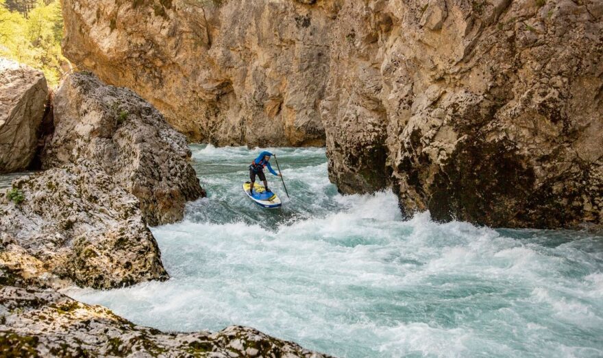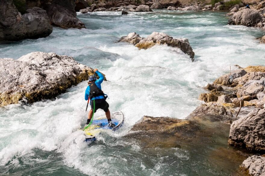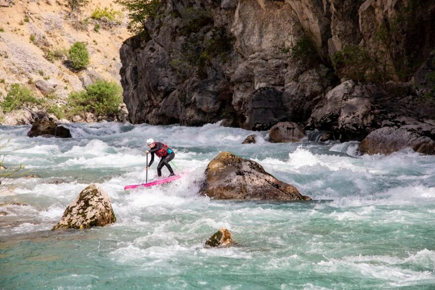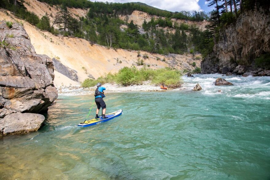 V zatáčce jsme přijeli k mohutné peřeji, navíc s kameny přímo ve vhodné lajně. S kajakem by to bylo snadné, ale paddleboard má ploutvičky, a ty přes kameny nepřeskočí. Už jsem si říkal, že se na to vykašleme a bude to naše první obnáška, ale Kristýna se rozhodla, že to chce jet jako druhá, a mně tedy nezbývalo nic jiného než být ten první. Zkusili jsme to každý celkem dvakrát, ale vždy jsme tam někde trochu zaplavali. Asi by to bylo možné sjet, ale museli bychom tomu věnovat více času a více vynášek, na které už jsme neměli sílu. Tuto peřej jsme si bohužel neodškrtli a museli se chystat na další, protože jsme se právě dostali do místa velkého sesuvu, který značil začátek Ďáblova kaňonu. Ještě asi 100 metrů bylo možné s opatrností sjet, ale poté už nebylo vidět, kam řeka pokračuje.