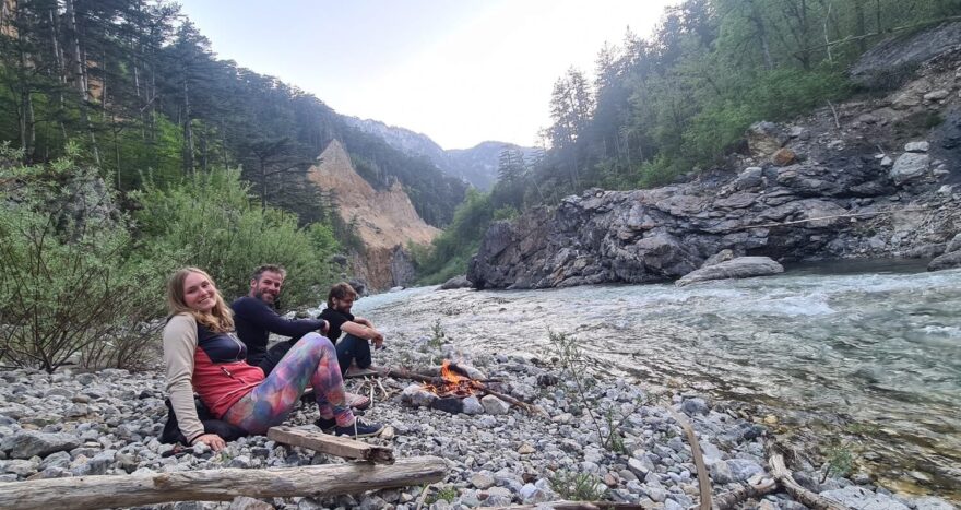 Zastavili jsme u pravého břehu a vydali se na průzkum. Kaňon začínal třemi rychle po sobě jdoucími válci, kdy ten poslední byl opravdu mohutný a ještě u něj byla menší jeskyně, do níž se valila část proudu. Proto jsme se rozhodli poprvé putovat s našimi prkny po břehu po proudu, ale až druhý den. Vzhledem k blížící se tmě jsme se rychle vydali hledat vhodné místo ke spaní. To jsme našli těsně nad kaňonem na malém ostrůvku uprostřed řeky. Písečné nánosy umožnily s pomocí pádel jako lopat vytvořit rovnou plochu pro stan a množství naplaveného dříví přímo lákalo k táboráku. Těsně před západem slunce se na nás přišly z protějšího břehu podívat horské kozy, které se ještě několikrát za večer vrátily, a navozovaly nám tu pravou atmosféru pobytu v nezkrocené divočině. I náš ostřílený a zcestovalý doprovod David „Vory“ Sodomka kvitoval, že takovou přírodní krásu v Evropě už ani nečekal.