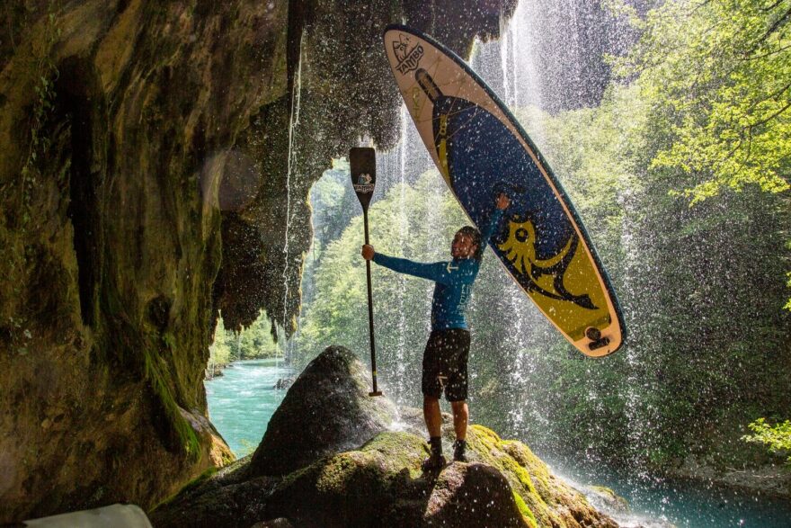 Okolí řeky vám často vyrazí dech. Sám jsem o tomto slovním obratu měl jisté pochybnosti, dokud jsem to na svůj vlastní vyražený dech nezažil. Jeli jsme v tu chvíli s Kikinou zrovna několik set metrů před naším doprovodem a diskutovali o problémech světové politiky nebo o možnostech sjíždění světových řek na paddleboardu, to už přesně nevím, každopádně poté co jsme vyrazili z levotočivé zatáčky, se před námi na pravém břehu objevil vodopád jako z krajiny Avatara. Asi půl minuty jsem na něj jen civěl a až poté začal tento vjem lépe zpracovávat a vymýšlet, jestli na něj půjde vylézt. Tyrkysově modrá voda se řítila z převislé skály a přes zelený koberec se vlévala do Tary. O 50 metrů dál bylo ještě další mohutné rameno. Zaparkovali jsme boardy u vody a vydali se na průzkum. Dostali jsme se „jen“ do prvního patra, ale i tak ten zážitek stál za to. Po návratu do ČR nám jeden kamarád prozradil, že kousek nad tímto vodopádem je vstup do obří jeskyně, ve které se dá dokonce pádlovat.