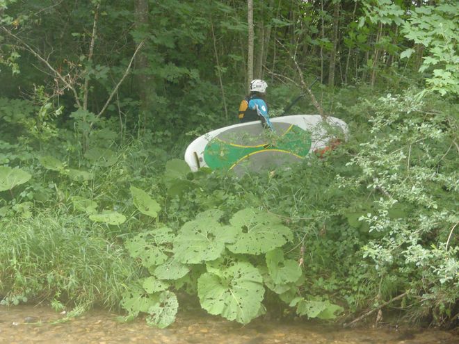 První přenáška začíná zhruba po 500 m nad stupněm, který rozhodně nemá dost vody na to, aby se dal skočit bez rozbití si kokosu. Ke svému překvapení vylézáme v ohradě s koněmi, a tak pro jistotu jdeme svižně pryč. Další přenáška dropu je asi po 100 metrech, tentokrát ji komplikuje neprostupná džungle. Dále následují mírně tekoucí pasáže, pár jezů, které přenášíme, někdy lépe, jindy obtížněji, a které nebyly ze silnice vidět. Následují kamenné stupínky do 40 cm. Dambach je na nás za nízké vody hodný, přehledný, jen je občas potřeba jet na klekačku, aby se nezadrhly flosny. Zhruba po dvou hodinách plavby po asi 2,5 km přistáváme ve městě nad jezem, po kterém se potok zavírá do navigace a následuje soustava jezů a i proto se rozhodujeme zde skončit, jsme dost vyčerpané přenášením. Vodočet pod mostkem ukazuje 40 cm, potok by rozhodně snesl vody trochu více, ale zhodnotily jsme jej vhodný pro neadrenalinové jezdce, kteří chtějí zažít expediční pádlování. Ale popravdě kvůli častým přenáškám bych podruhé nejspíš nejela, ale i takové oběti musí nastávat, abychom si řekli, tudy ne. Danče je zima a tak se nezdráhá doběhnout pro auto. Já se zatím ve vodáckém oblečení se zavřenýma očima povaluji na trávě a v jedné paní tak budím dojem, že jsem se asi přitopila. Zastavuje své auto a běží se mě zeptat, jestli jsem v pořádku. To už přijíždí Danča, rychle balíme a jedeme za město spáchat něco k obědu.