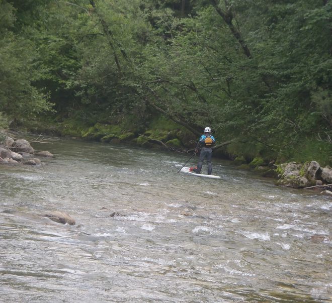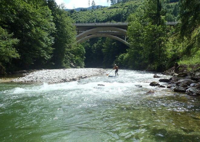 Středa je náš první pádlovací den. V plánu je Teichl. Danča má obavy, aby neměl moc vody po deštích a po cestě na nasedačku nás zaujme menší potůček Dambach, který není popsaný v kilometráži a určitě nemá vodu každý den. V hlavách se rodí myšlenka jet prozkoumat tenhle kousek a dát jeho prvosjezd na paddleboardu, možná prvosjezd vůbec. Projíždíme Windischgarsten, kde prohlížíme, jestli je vody dost a shledáváme jej sjízdným a vhodným na rozpádlování. Obtížnost potoka je do WW I. Jedeme ještě kousek nad městečko Edlbach k mostku, nad nímž je již vody málo. Tady nafukujeme boardy a začínáme plavbu.