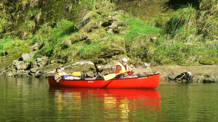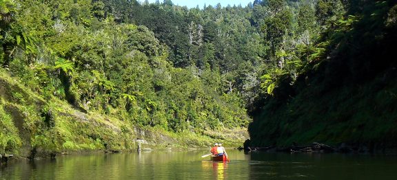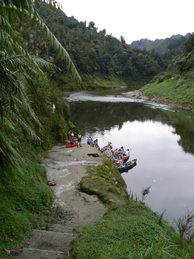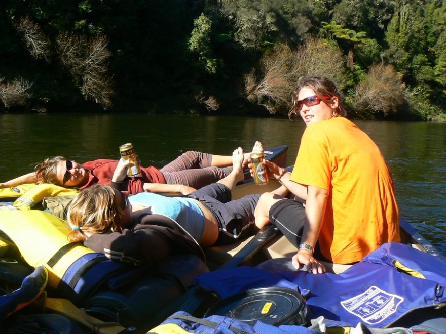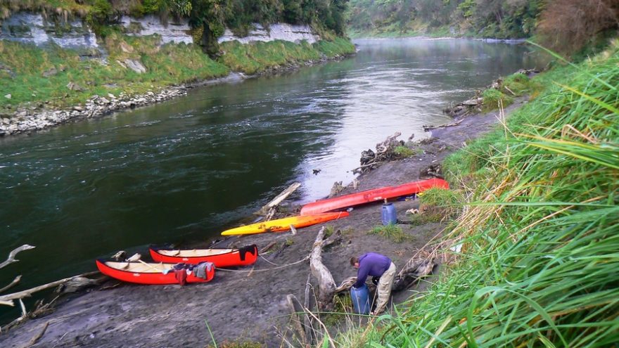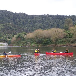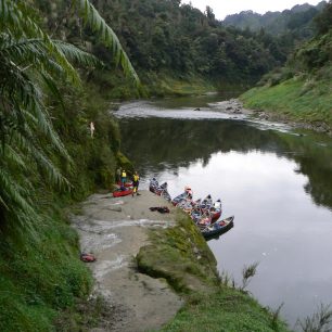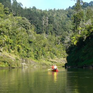 První den nás čeká 35 kilometrů do Whakahoro, kde je první chata. Je krásný den, ačkoli už je podzim v plném proudu. Řeka se táhne hustě zarostlou džunglí a my to pádlování pojímáme pěkně po česku, soulodíme, popíjíme a užíváme si ten božský klid a přírodu. Jenže čas kvapí, sluníčko míň a míň hřeje a my zřejmě budeme muset začít pořádně pádlovat, chceme-li dojet do chaty. Vůbec nevíme, kde jsme. Navíc se Alešovi podaří nás překlopit. Naštěstí všechno včetně nás pochytáme a znovu naložíme. Rychle pádlujeme, protože teď teprve začíná být pořádná zima. Nakonec už za šera doplouváme do nějakého kempu.
