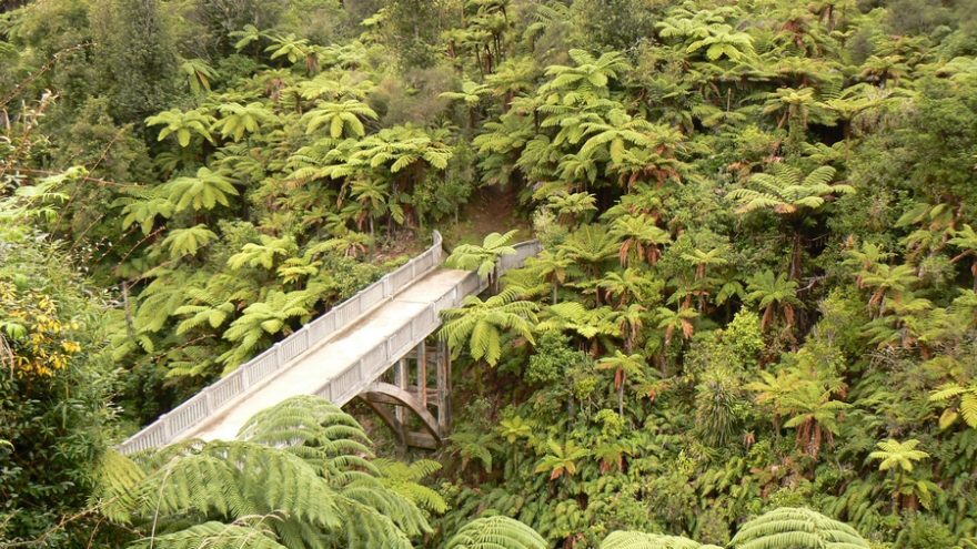 Co tady ten most dělá?, divíme se a nechápeme. Pak ale objevíme na mostě ceduli: „Stavba tohoto mostu začala v lednu 1935 a dokončena byla v červnu 1936. Most byl postaven, aby usnadnil dopravní přístup k řece Whanganui a aby spojil osadníky údolí s říčním provozem. V roce 1917 zpřístupnila vláda zdejší zemi vojákům, kteří se vrátili z 1. světové války. Panenské lesy byly vykáceny, a celkem tak vzniklo 35 držav. Po závažné záplavě téhož roku vláda odmítla dále investovat do udržování silnice a údolí bylo oficiálně zavřeno v květnu 1942.“