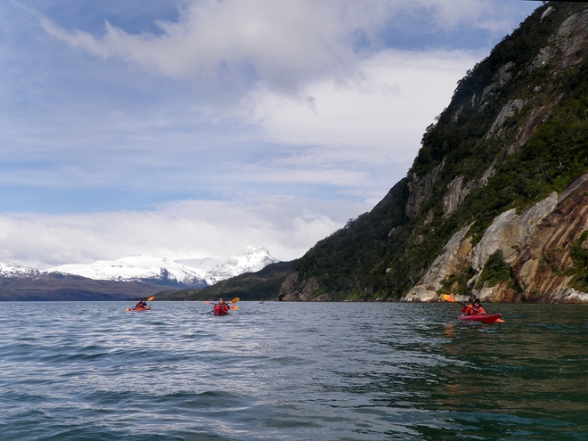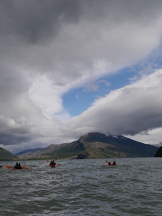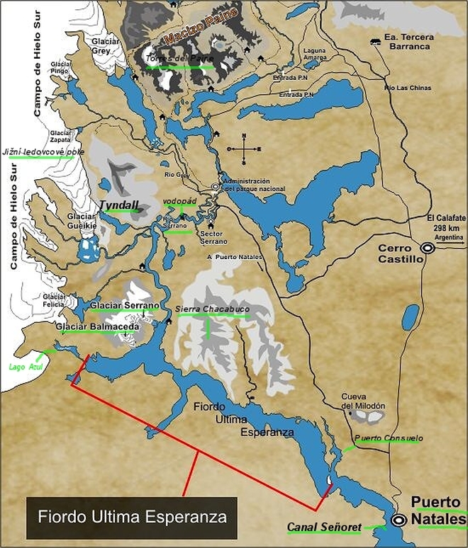 Tak nějak vypadá průvodcování na seakayaku v Patagonii, vágně definovaném území na samém jihu amerického kontinentu. Mým působištěm je už druhým rokem chilské město Puerto Natales, okolní fjordy, řeky a národní parky Torres del Paine a Bernardo O´Higgins. V Torres del Paine začínáme i náš nejoblíbenější výlet – sjezd mohutné ledovcové řeky Serrano z parku až do jejího ústí ve fjordu Última Esperanza, neboli fjordu Poslední naděje. Pro paní mnou taženou bylo po celodenní jízdě v kroupové masáži tábořiště na březích fjordu opravdu poslední nadějí.