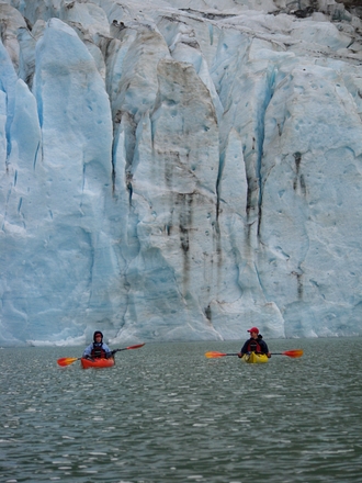 U čaje a polévky se vrací klientům barva a řeč a zhruba za hodinku se opět objevuje náš kamarád José na zodiacu. Nemůže ale zajet do lesa, a tak jednoho klienta po druhém taháme zpět do vln a dost složitým manévrem vysazujeme z kajaku do zodiacu. Když už jsme i se všemi kajaky na palubě, přicházejí si Vegouši na své. Konečně mohou v klidu sedět a fotografovat ledovce. Řeku s námi sjíždějí i velké klády a ostrůvky trávy, které se i se stromky utrhávají ze břehů. Saritha zcela vážně přiznává, že si při objednávání pětidenního programu spletla plavidla kajak a zodiac.