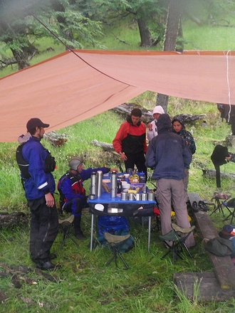 Má sofistikovaná kajakářská výbava se časem ustálila na variabilním množství vrstvených triček, dobré nepromokavé bundě, obyčejných, téměř gumových kalhotách, šátku a jedné až dvou čepicích, vše završeno co nejvyššími holinkami značky Baťa, které jsou v Jižní Americe velmi populární. Šanci převléknout se má průvodce většinou až když už jsou klienti uloženi ve spacáku. Neprodleně po příjezdu na tábořiště je totiž nutné rychle vyrobit přístřešek, rozdělat oheň, začít servírovat jídlo a neustále ohřívat vodu na teplé nápoje. Jakýkoliv průšvih s počasím se totiž dá zachránit, vytáhnete-li uprostřed lesa láhev chilského vína a olivy.