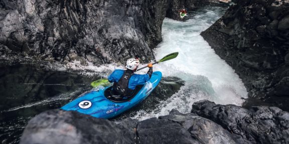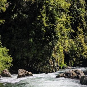 Po soutoku ihned vplouváme mezi skalami do Inferna. Řeka se sklápí, nabíráme rychlost a začíná to houpat. Obrovská síla nás táhne směrem k obřím roládám a vlnám, ze kterých vidíte jen bílé čepice a občas kajakáře před vámi, jak si přes ně razí cestu. Hlavně se držet ve středu, nezajíždět ke krajům. Jedeme spolu, ale každý sám za sebe.