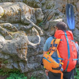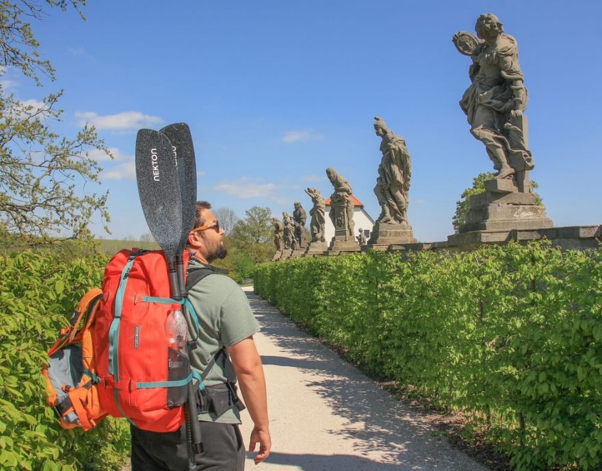 Tady vytahuju suché věci, mokré včetně packraftu dávám do batohu, zvenku na něj pověsím vestu a pádlo, které by se dovnitř vešly jen těžko a vyrážím pěšky na prohlídku okolních pamětihodností a zároveň zpět k autu. Nejprve procházím samotný Kuks, kde jsou k vidění třeba krásné roubenky, poté si prohlížím hospital a jeho okolí včetně botanické zahrady a potom už se vydávám po žluté turistické značce.