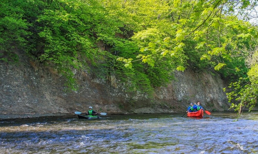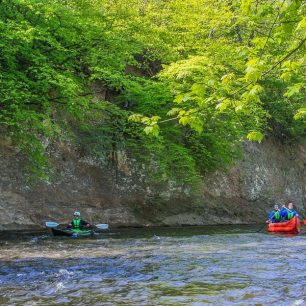 Když už nám zatáčky a peřejky připadají ohrané, přichází další překvapení – na pravém břehu se z ničeho nic objeví vysoká skalní stěna. Je na ni úžasný pohled a plavba je díky ní zase o něco hodnotnější. Další podobný útvar přichází jen o kousek níž a pak už řeka teče hlubokým korytem přibližně tři metry pod úrovní okolního terénu. Výhledy do krajiny tedy moc nemáme, ale rozeklané stromy v okolí koryta nám na kochání stačí a stejně musíme pořád koukat před lodě, protože Labe nepřestává téct a vlnit se. Nikdo z nás tak svižnou plavbu nečekal. Jsme nadšení.