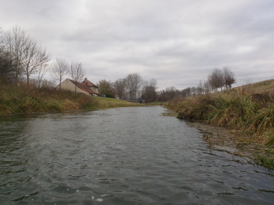 Jeho tok se zdá poklidný a v celku průjezdný. Jak se ale ukazuje, tah vody je silný a o složité průjezdy tu opravdu není nouze. Tři padlé stromy s drobnou obtížností podjíždím, jeden přejíždím, ale v jednom meandru musím ven. Několik mohutných stromů v řečišti kompletně zablokovalo tok po celé šířce a ani podeskymování zde není možné. Otáčím a směřuji proti toku ke vzdálenějšímu místečku, kde se dá lehko vystoupit suchou nohou.
