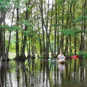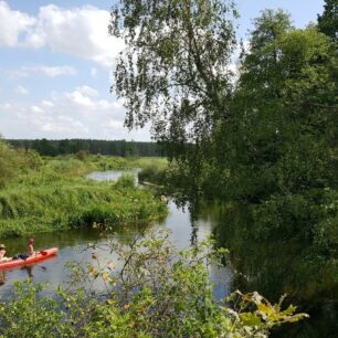 Ale krásy Welu Piekiełkem zdaleka nekončí. U jezu a mlýnu Lorki-Młyn se řeka rozděluje. Koryto starého Welu (vpravo) je víceméně bez vody, a jezdí se tedy novým ramenem, které propojilo ledovcová jezera původního malého přítoku. Z posledního jezera je prokopaný propojovací kanál do původního toku řeky. Zní to industriálně, ale dnes jde o nádherný kus říční přírody. Říká se mu Bałwanka. I tady plavba vyžaduje pevné nervy a jistou vodácká zručnost. Mělká jezera jsou plná bahna a jsou zarostlá rákosím, řasou, lekníny a stulíky, takže najít správnou cestu není úplně jednoduché. Rostlinstvo naznačuje, že hloubka okrajových partií jezer je kolem 80 cm a na dně má být údajně až metr bahna. Takže vystupovat do vody bych rozhodně nedoporučoval. Chce to klid a rozvahu, rákosiny naštěstí nejsou příliš dlouhé, a když vjedete na širou hladinu jezer, odmění vás klasická krása – plantáže stulíků i leknínů, labutě, kormoráni a hlavně absolutní klid a liduprázdno.