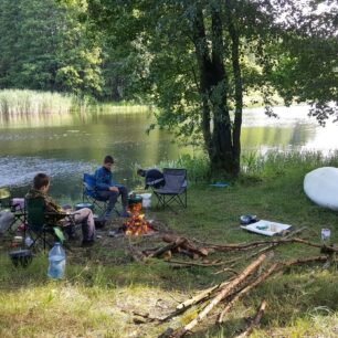 My jsme splutí Piławy zahájili v místě výtoku řeky z jezera Pile. Tam na obou březích fungují vodácká tábořiště. První, co nás v řece překvapilo, byla vysoká teplota vody, která se ohřívá na obrovské ploše jezer. Koupání na sebe nenechalo dlouho čekat.