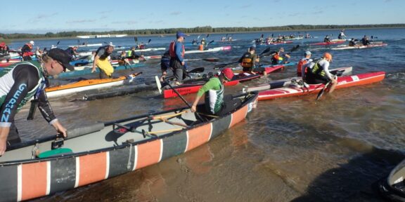 Start je naplánován na sobotní pravé poledne, ale už od rána začíná skvělá organizační práce pořadatelů. Lodě navazují na vleky a nás na start odváží velký kloubový autobus. Když se rozestoupí ranní mlha, vykoukne na nás sluníčko. To je hned jiná pohoda – rázem je teplo na tričko. Lodě máme složené z vleků, jen je kousek přenášíme na písečnou pláž.